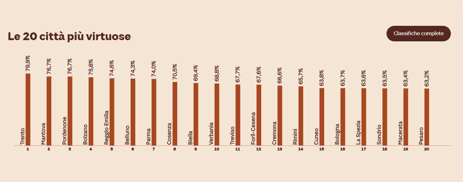 COSENZA La città dei bruzi rientra nella top ten dei capoluoghi più virtuosi d’Italia in tema di ecosistema urbano. Unica città, tra l’altro del Sud, riesce a conquistare l’ottavo posto nella classifica dalle 104 realtà prese in considerazione dalla ricerca condotta da Legambiente in collaborazione con Ambiente Italia sullo stato di salute dei capoluoghi di provincia italiani. La ricerca “Ecosistema urbano, che è giunta alla ventisettesima edizione ed è stata pubblicata sul Il Sole 24 ore, ha tracciato la qualità dell’ambiente ma anche dell’offerta di servizi pubblici locali presenti nelle 104 città capoluogo passando in particolare in rassegna 18 parametri raggruppati in 5 macroaree (aria, acqua, rifiuti, mobilità ed ambiente) nel corso del 2019. Ebbene raggruppando tutti questi parametri e verificando il rispetto per ognuno dei limiti di legge imposti dalla normativa di settore, è stato posto il valore 100 per l’eventuale raggiungimento di questi parametri. E Cosenza ha raggiunto il ragguardevole risultato di 70,5%. Ponendosi subito dopo di Trento – la più virtuosa d’Italia – (79,9%), Mantova e Pordenone (entrambi a 76,7%), seguite da Bolzano (75,8%), Reggio Emilia (74,6%), Belluno (74,3%) ed infine Parma (74%). Molto al di sopra degli altri capoluoghi che seguono Cosenza e staccando di gran lunga le altre realtà del Mezzogiorno. Nessuna dei quali, seguendo questa valutazione, rientra neppure nella top 20.