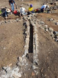 Lo scavo 2018 ha permesso di indagare un tratto significativo della plateia A, per una trentina di metri, rinvenuta ingombra dello strato di abbandono e distruzione delle strutture, in parte crollate nella carreggiata, come dimostra la presenza di un intero segmento murario lungo alcuni metri, collassato sulla strada.