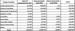 LAMEZIA TERME Spendono quasi tutto in personale. Ai gruppi consiliari di Palazzo Campanella viene assegnato 1 milione e 582mila euro. Quasi 1 milione e 300mila viene distribuito in stipendi per i collaboratori delle strutture politiche, il resto finisce in spese di funzionamento. Vale per tutti. Il gruppo del Pd è il più corposo e, di conseguenza, costoso, con 428mila euro investiti nei collaboratori. Seguono Oliverio presidente (210mila euro), il gruppo Misto (150mila) e – praticamente appaiati con 122mila euro – Democratici progressisti e Nuovo Centro Destra. Sono dati contenuti nel rendiconto finanziario 2017 dell’assemblea legislativa calabrese, approvato dall’Ufficio di presidenza del Consiglio regionale.