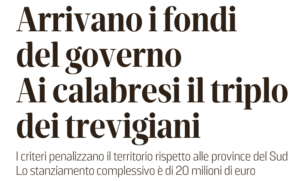 Catanzaro avrà 7,3 milioni – 1,3 più della Marca, con soli 363 mila abitanti, il 40% di tutta la Marca. Anche per i Comuni sotto i 20mila abitanti il discorso resta invariato, con la sola eccezione della provincia di Cosenza. I 6 milioni per la Marca si spalmano su 87 Comuni e ogni trevigiano riceve meno di 10 € a testa: 9,83 €. In Calabria la distribuzione privilegia in particolare la provincia di Catanzaro, che riceve 7,34 milioni che si spalmeranno una platea di 200 mila abitanti. Ovvero 36,5 euro per abitante, il quadruplo di Treviso e provincia. Vibo Valentia avrà 2,3 milioni per 128mila abitanti nei comuni sotto i 20mila, cioè 18,11 € pro capite. E via discorrendo anche per Reggio Calabria e Crotone (13,74 € i reggini e 13,21 i crotonesi). Solo nel Cosentino il dato scende drasticamente: 7,3 € a testa. I sindaci sarebbero già pronti alla protesta contro la distribuzione delle risorse. Forse, però, dimenticano il modo in cui l’applicazione delle norme sul federalismo fiscale ha cancellato i servizi al Sud e dimenticato la Costituzione.