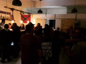 Fra magliette che inneggiano allo squadrismo, qualche braccio teso, manifestini di Ezra Pound alle pareti, un salvadanaio con paperino che mendica una moneta «per la rivoluzione» e letteratura di “area” da Luca Leonello Rimbotti a Stelio Fergola, l’evento è stata una (assai confusa, pare) celebrazione di tutte le sfumature dell’estrema destra, con un po’ di razzismo a coagulare il tutto. A seguire – raccontano i post di chi c’era –un concerto. Celebrativo, ovviamente.