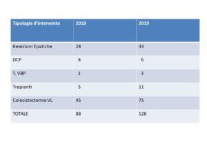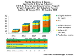 Per i tumori del fegato, l’equipe fa numeri importanti; i dati validati da Agenas indicano complessivamente 77 casi trattati nel 2016, meglio del policlinico Umberto I di Roma o di altre strutture del Centro Sud. Il reparto diretto da Vaccarisi, secondo i dati di monitoraggio e controllo nel 2018 ha totalizzato 276 ricoveri, di cui 56 dalle altre province della Calabria e 2 da fuori regione. Raffrontando i primi 5 mesi del 2018 con lo stesso periodo del 2019, i dati di monitoraggio fanno registrare un aumento complessivo di ricoveri da 88 a 128 con un aumento del 45%. (vedi grafici).