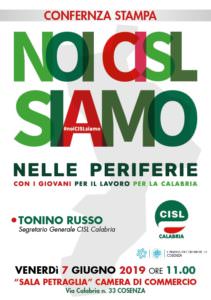 COSENZA «Noi Cisl siamo nelle periferie con i giovani per il lavoro e per la Calabria». È il tema della conferenza regionale di Cisl Calabria che verrà presentata venerdì 7 giugno con inizio alle ore 11 nella “Sala Petraglia” della Camera di Commercio di Cosenza. Nell’occasione il segretario generale della Cisl Calabria Tonino Russo incontrerà la stampa per spiegare nel dettaglio l’iniziativa che si svolgerà martedì 11 giugno sempre nel capoluogo bruzio. Argomenti