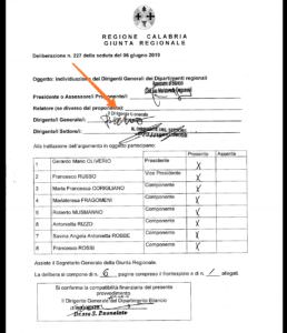La “camicia” della delibera. La freccia indica la firma di Bruno Zito, che sarà tra i nominati in quella seduta«L’AUTONOMINA DEL DIRIGENTE DEL PERSONALE» Nella delibera omnibus sono inseriti: Orsola Reillo al dipartimento “Ambiente e Territorio”, Filippo De Cello a “Bilancio, Patrimonio e Finanze”, Carmine Barbaro a “Sviluppo Economico, Attività Produttive”, Giacomo Giovinazzo ad “Agricoltura e Risorse Agroalimentari”, Sonia Tallarico ad “Istruzione e Attività Culturali”, Francesca Gatto a “Turismo e Spettacolo”, Domenico Schiava a “Urbanistica e Beni Culturali” e Bruno Zito a “Organizzazione e Risorse Umane”. «E qui – per il sindacato – casca l’asino. A quanto pare, ad otto giorni dalla sua adozione, la delibera è stata formalizzata soltanto nella seduta di giunta del 14 giugno. A firmare è stato lo stesso Bruno Zito, che quindi ha proposto “l’autoproclamazione” da direttore generale del Personale. L’autonomina del dg è suffragata anche dalla firma dell’assessore “competente” Maria Teresa Fragomeni e dal dirigente del settore Economico del Personale Luciano Rossi. Come mai è arrivato il suggello scritto del settore Economico? Eppure nell’individuazione degli incarichi, di regola, ad occuparsene è il Settore giuridico del dipartimento. Vuoi vedere che la definizione della delibera è arrivata quando quest’ultimo era assente? A che titolo del conferimento degli incarichi se ne occupa il settore Economico?».