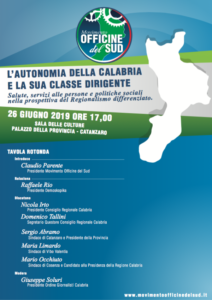 rotonda, organizzata dal Movimento “Officine del Sud” che si svolgerà mercoledì 26 giugno con inizio alle ore 17 nella Sala delle Culture del Palazzo della Provincia di Catanzaro.