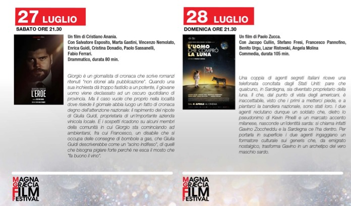 LA RASSEGNA CINEMA Dedicata al grande regista Sergio Leone, nel trentesimo anno della sua scomparsa, la 16esima edizione del Magna Graecia Film Festival conferma la presenza alla conduzione dell’attrice Carolina Di Domenico. Tra gli ospiti più attesi, la madrina dell’evento Euridice Evita Axen, l’attrice Isabella Ferrari e l’attore statunitense Christopher Lambert, leggendario interprete di “Highlander”. La giuria sarà presieduta da Alessandro Genovesi e sarà composta da Chiara Francini, Edoardo Leo, Dino Abbrescia, Claudia Potenza e Paola Minaccioni. Sette le opere, prime e seconde, in concorso: “L’Eroe” di Cristiano Anania (in proiezione il 27 luglio), “L’uomo che comprò la luna” di Paolo Zucca (28 luglio), “Euforia” di Valeria Golino (29 luglio), “In Viaggio con Adele” di Alessandro Capitani (30 luglio), “Ride” di Valeria Mastandrea (31 luglio), “Drive me home” di Simone Catania (1 agosto) e “Domani è un altro giorno” di Simone Spada (2 agosto). “A sorpresa” sarà – ha annunciato Casadonte – la serata del 3 agosto, premiazioni il 4 agosto. Le colonne d’ora per i premiati saranno realizzate dal maestro orafo Michele Affidato. Non mancheranno gli eventi musicali, con le performance di Levante e della youtuber Giulia Penna. Tra le masterclass, che si terranno al Supercinema e all’Auditorium, Lamberti, Ferrari, Mastandrea, Alessandro Haber.