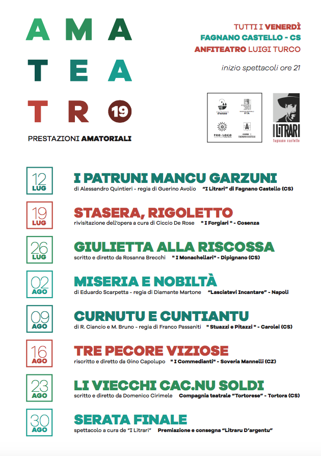 Da venerdì 12 luglio l’anfiteatro comunale di Fagnano Castello ospiterà la settima edizione di Amateatro – prestazioni amatoriali 2019, rassegna nazionale di teatro amatoriale organizzata dall’associazione culturale “I Litrari” di Fagnano Castello con il patrocinio della Fita Cosenza, della Pro Loco di Fagnano Castello e del Comune di Fagnano Castello.