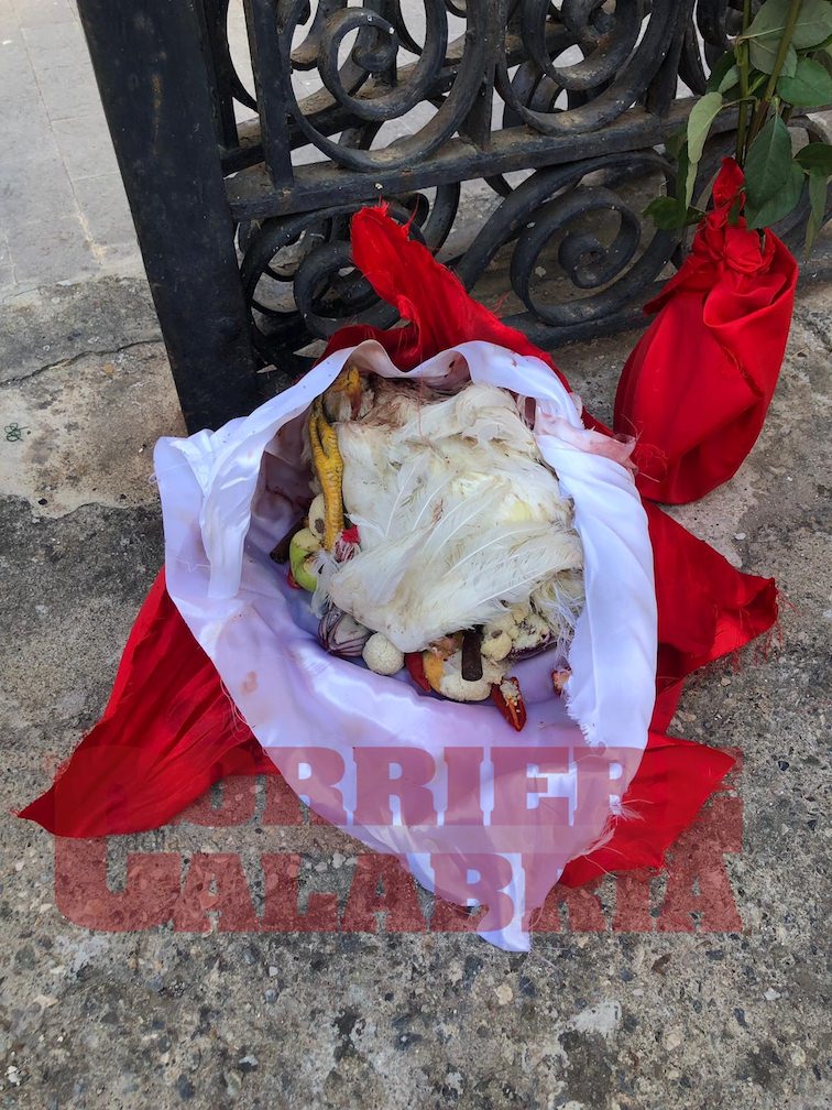 AMANTEA Resti di una gallina sgozzata e sezionata, frutta e verdure tagliate a metà, amuleti, monili e fiori. Ma anche palline di pane, sigari e sigarette. Simboli di un rito oscuro e sconosciuto. E un luogo di ritrovamento – il cimitero – che restituisce un’immagine decisamente tetra di quanto è potuto accadere davanti al camposanto di Amantea.