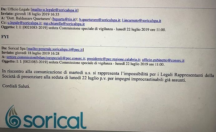 CATANZARO «I commissari liquidatori della Sorical non si sono mai sottratti alle prerogative del consiglio regionale e hanno sempre collaborato alle richieste di chiarimento, tant’è che nel 2019 sono stati auditi, in due distinte sedute, sia dalla Commissione Vigilanza che dalla Commissione Bilancio. Giovedì scorso, 18 luglio, alle ore 16,28, l’Ufficio Legale della Sorical ha comunicato formalmente alla segreteria amministrativa dalla Commissione Vigilanza l’impossibilità dei Commissari a partecipare alla seduta, causa impegni precedenti». È quanto si legge in una nota pubblicata da Sorical sul proprio sito dopo le polemiche sorte in seno alla Commissione di Vigilanza (ve ne abbiamo parlato qui). «I Commissari Liquidatori – conclude la nota – restano in attesa di una nuova convocazione».