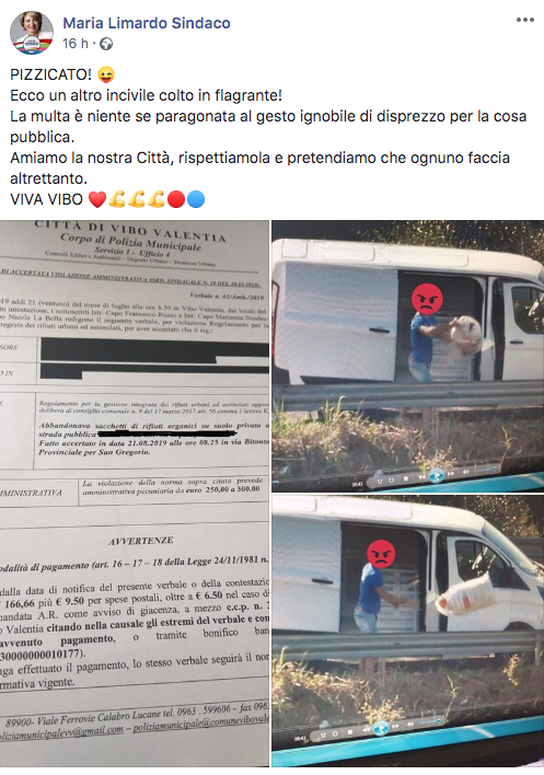 VIBO VALENTIA «Ecco un altro incivile colto in flagrante!». È il commento messo a corredo di alcune foto che il sindaco di Vibo, Maria Limardo, affida sulla sua pagina facebook contro quanti abbandonano sacchetti di rifiuti in città.