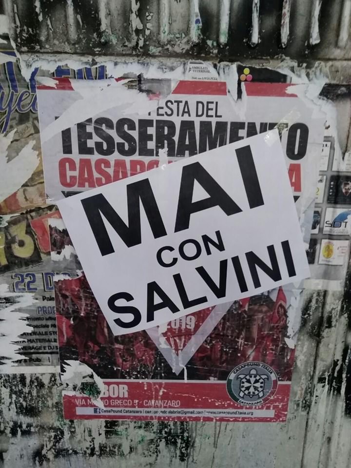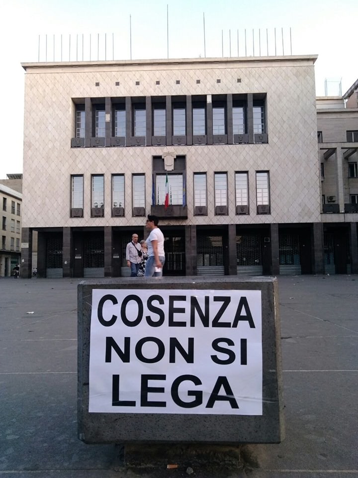 LA MOBILITAZIONE Intanto continua la mobilitazione in vista della contromanifestazione che scatterà martedì prossimo alle 17 da piazza dei Bruzi. Agli incontri dal vivo si somma la mobilitazione sul web, con il gruppo Fb “Stutamu Salvini” che in pochi giorni è arrivato a più di 5mila aderenti. Nei giorni scorsi i cartelli “Cosenza non si Lega” sono spuntati sulle porte degli esercizi commerciali assieme a scritte sui balconi, fotografie, meme e video con i quali il fronte anti-sovranista (e non solo) ha chiarito di non gradire la presenza del leader leghista in città. Lunedì, a partire dalle 19, in piazza Valdesi, gli organizzatori della protesta hanno invitato i cittadini «a “intervenire” artisticamente o, più semplicemente, a portare la nostra presenza in piazza» per farsi trovare preparati all’appuntamento del giorno dopo.