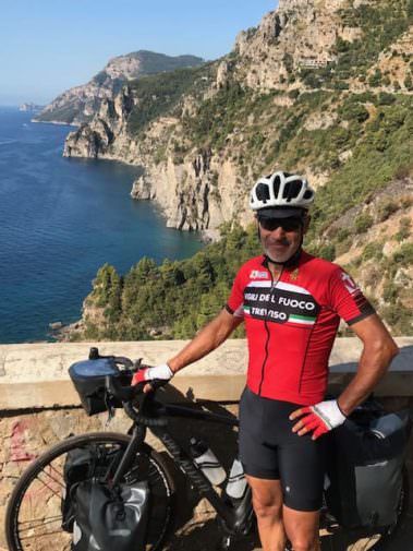 Con tanto di permesso del ministero dell’Interno, alla fine di ogni sua tappa, approfittando della sosta, saluta con commozione i Vigili del Fuoco che aprono a lui cuore e caserma e danno la carica giusta per continuare questa impresa.