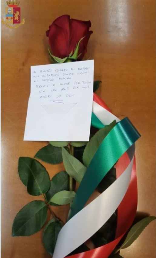 A VIBO UNA SIGNORA LASCIA UN BIGLIETTO E UNA ROSA DAVANTI LA QUESTURA «In questo giorno di dolore noi cittadini vi siamo vicini. Grazie di cuore per tutto ciò che fate per noi. Onore a voi». Questo è il semplice e toccante tenore del bigliettino che, unitamente a una splendida rosa rossa con nastro tricolore, una signora di Vibo Valentia stamattina ha consegnato al corpo della guardia della Questura, con l’intento di partecipare al cordoglio che ha colpito la Polizia di Stato per la tragica fine di Pierluigi Rotta e Matteo Demenego, i giovani poliziotti uccisi ieri a Trieste nell’adempimento del loro dovere.