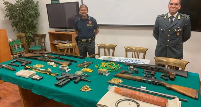 La Guardia di finanza ha tratto in arresto un uomo di 31 anni. Deteneva un panetto di droga da un chilo, due chili e mezzo di esplosivo e 14 tra mitragliatrici, fucili e pistole
