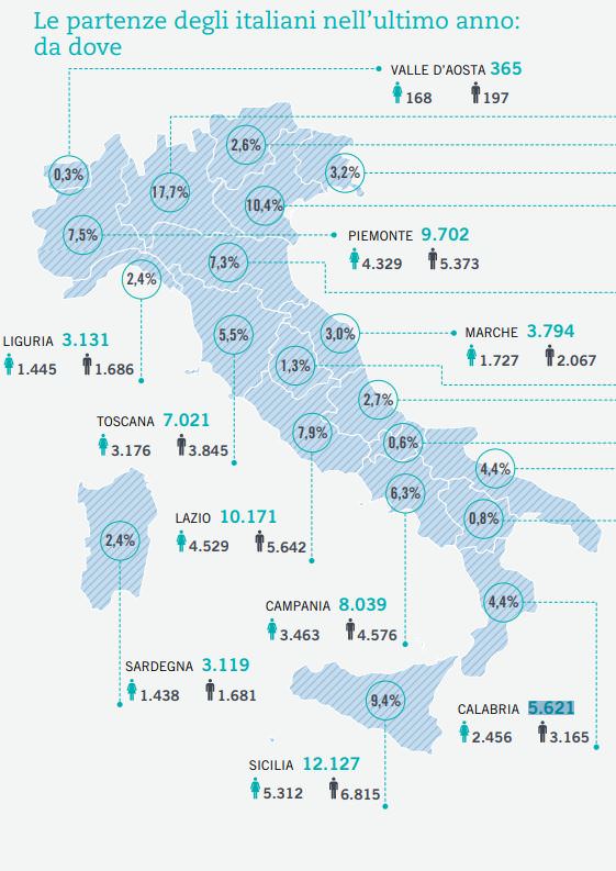 Tra gli emigranti dell’ultimo anno, i calabresi rappresentano il 4,4% del totale: un dato elevatissimo se si pensa che la popolazione della nostra regione rappresenta circa un trentesimo di quella nazionale. Di costoro, il 48% sono donne.