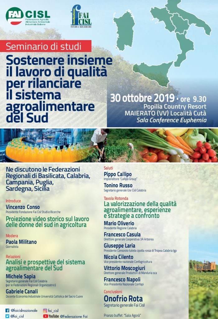 MAIERATO “Sostenere insieme il lavoro di qualità per rilanciare il sistema agroalimentare del Sud”. È il tema del seminario di studi promosso dalla Fai, la federazione agroalimentare industriale e ambientale della Cisl, e dalla Fondazione Fai Cisl Studi e Ricerche che si svolgerà tra il 28 e 30 ottobre prossimo al Popilia Conutry Resort di Maierato, in provincia di Vibo Valentia.