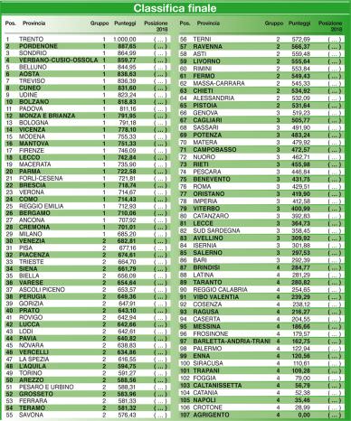 A conferma degli eccellenti piazzamenti già conseguiti nelle passate edizioni dell’indagine, Isernia si classifica al primo posto nella dimensione del sistema salute, che intende fornire uno spaccato sulla dotazione di strutture sanitarie. A seguire nelle posizioni di testa Catanzaro, Cagliari e Ancona. Chiude la classifica Vibo Valentia. Siena si conferma al primo posto nella classifica del tempo libero e turismo, confermando i piazzamenti conseguiti nelle cinque passate edizioni, così come Rimini, Aosta e Verbano-Cusio-Ossola, mentre Grosseto si piazza in quinta posizione. Il gruppo di testa comprende 21 province ed è caratterizzato da una notevole stabilità nel tempo, con una presenza pressoché esclusiva di province dell’Italia centro-settentrionale, a eccezione della provincia di Sassari in rappresentanza dell’Italia meridionale e insulare. Come negli anni passati, chiude la classifica Crotone. Infine è Milano che apre la classifica sul tenore di vita. A seguire nel gruppo di testa, Bologna, Monza e Brianza e Trieste. Roma è solo 44. Ultima, Crotone. (Ansa)