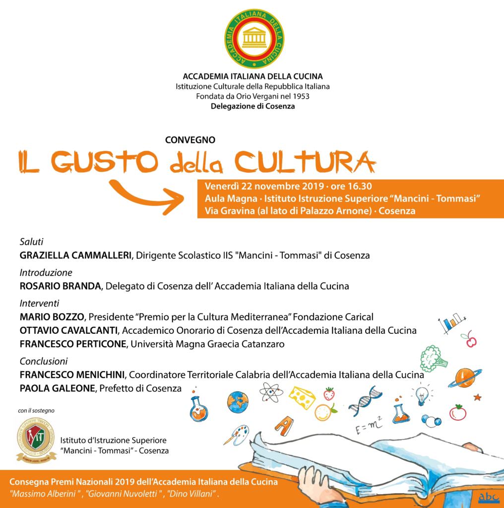 COSENZA “Il Gusto della Cultura” è il titolo del convegno organizzato per domani 22 novembre alle 16.30, presso la sede di Via Gravina dell’Istituto “Mancini-Tommasi” di Cosenza, dalla delegazione cosentina dell’Accademia Italiana della Cucina, presieduta da Rosario Branda. Fondata nel 1953 e riconosciuta nel 2003 quale “Istituzione Culturale” della Presidenza della Repubblica Italiana, l’Accademia aderisce alla “Settimana della cucina italiana nel mondo” con l’obiettivo di diffondere educazione alimentare e cultura del gusto. «Dietro ogni preparazione – anticipa il Delegato Rosario Branda, appassionato di cibo e sommelier – c’è un portato culturale fatto di tipicità, cultura e tradizione. La cultura ha tante facce ed ognuna si arricchisce di sfumature. Se a fare da protagonisti sono cibo, cucina ed arte nella trasformazione, il gusto aumenta e si sublima. Provare a scoprirne qualcuna e condividerne le riflessioni rappresenta la suggestione virtuosa dell’Accademia». L’iniziativa si arricchirà degli interventi di Felicita Cinnante dell’Istituto “Mancini – Tommasi”, di Mario Bozzo della Fondazione Carical, di Francesco Perticone dell’Università Magna Graecia di Catanzaro, dell’Accademico Onorario di Cosenza Ottavio Cavalcanti e del Coordinatore regionale Francesco Menichini. Concluderà i lavori il Prefetto di Cosenza Paola Galeone. Verranno, inoltre, consegnati i Premi nazionali 2019 “Alberini”, “Nuvoletti e “Villani, attribuiti dall’Accademia per valorizzare le eccellenza territoriali.