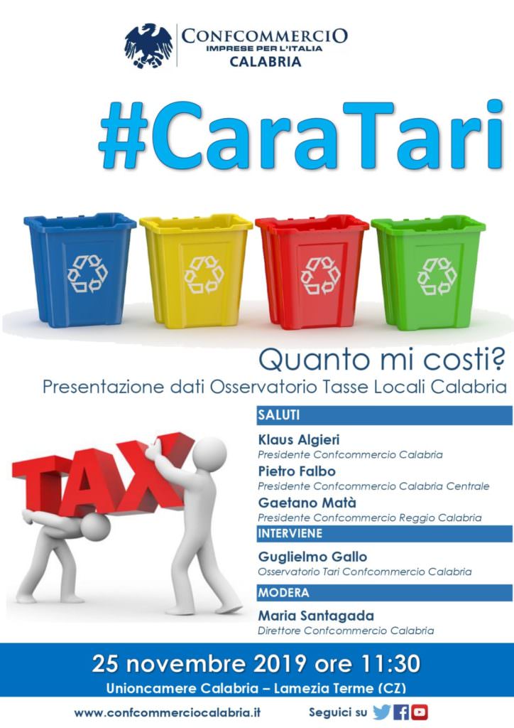 LAMEZIA TERME Il prossimo 25 novembre alle ore 11:30 presso la sede di Unioncamere Calabria in via delle Nazioni a Lamezia Terme si terrà il convegno organizzato da Confcommercio Calabria dal titolo “#CaraTari. Quanto mi costi?” il cui scopo è quello di far luce sui livelli di tassazione dei Comuni sulle imprese della nostra regione. Nel corso dell’evento, infatti, saranno presentati i dati dell’Osservatorio Regionale sulle Tasse Locali.