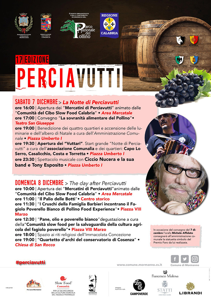 Nel ricco programma che vedrà in concerto Ciccio Nucera con la sua band e Tony Esposito nella serata del 7 dicembre in Piazza Umberto I, grande spazio ai prodotti della rete territoriale calabrese con la chiocciola attraverso il Mercato delle Comunità del Cibo presso l’area mercatale, che radunerà a Mormanno le esperienze più significative ed i produttori impegnati in Calabria nella produzione del cibo buono, pulito e giusto. Sabato la grande festa prenderà il via con la benedizione dei quartieri e l’accensione delle luminarie e dell’albero di Natale alle ore 19.00 da Piazza Umberto I e la conseguente apertura dei Vuttari nei quartieri Capo Lo Serro, Casalicchio, Costa e Torretta che in questi giorni sono al lavoro per arrivare preparati all’appuntamento, grazie al coinvolgimento di oltre 200 volontari che sono l’esempio lampante di come “Perciavutti” a Mormanno sia festa di popolo.