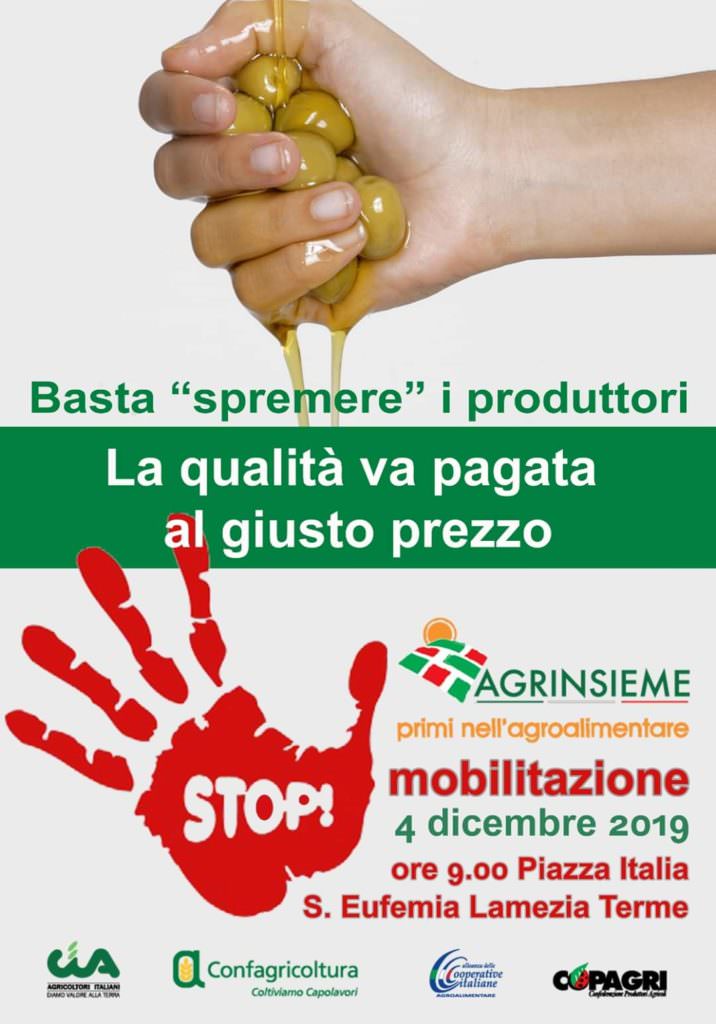 LAMEZIA TERME Domani, Mercoledì 4 dicembre i produttori di olio scendono in piazza per manifestare il loro malcontento determinato dalla maggiore produzione di olio d’oliva nella campagna appena avviata, con conseguente abbassamento del prezzo all’origine degli oli.