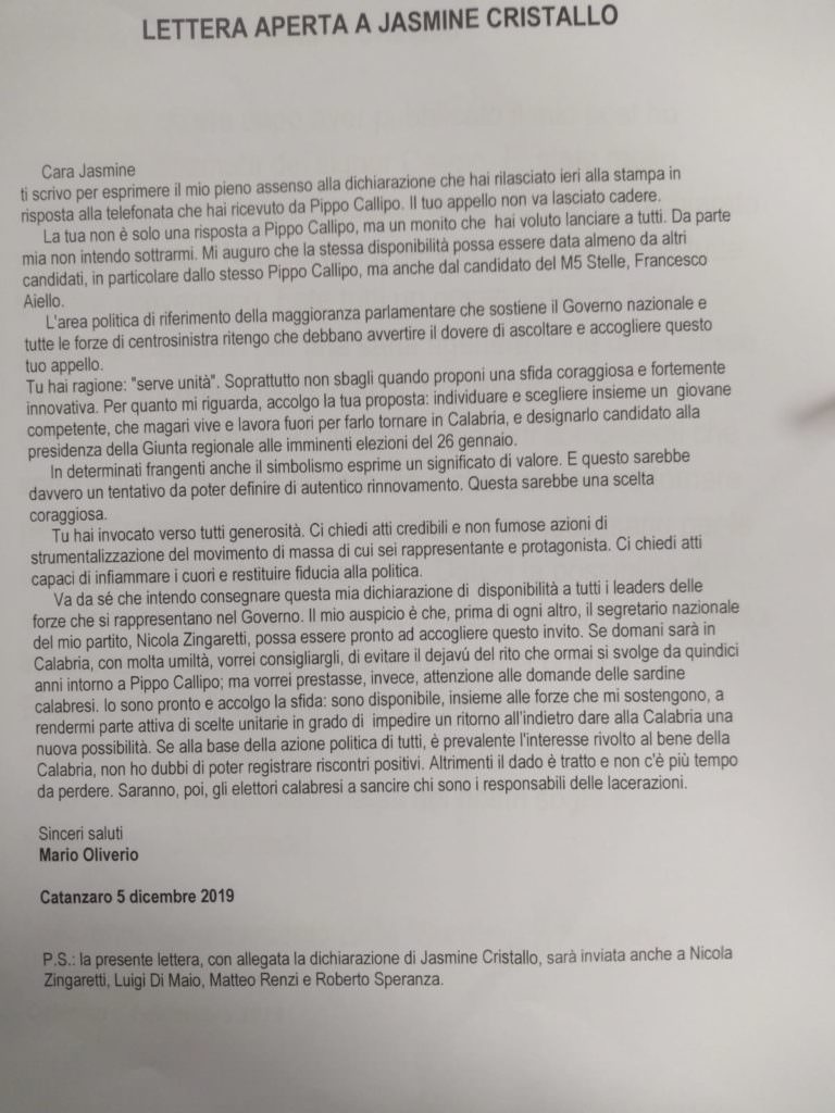 CATANZARO Ieri sera l’annuncio della formazione di cinque liste pronte a sostenerlo, oggi il colpo di teatro. Mario Oliverio è pronto a fare un passo indietro, a patto che lo faccia tutto il fronte giallorosso (o rosa). Via tutti i candidati in campo (il governatore, Pippo Callipo per il Pd, Francesco Aiello per il M5S), dentro un giovane «magari facendolo rientrare da fuori». La linea la detta – così spiega Oliverio ai giornalisti – Jasmine Cristallo, creatrice del movimento dei Balconi e referente calabrese delle Sardine. La detta, piuttosto, un suo post su Facebook ripreso ieri dal Corriere della Calabria (potete leggerlo qui) in cui, in estrema sintesi, esorta tutti a «fare un passo indietro e pensare alla Calabria». Oliverio dice di voler raccogliere la sfida e al post di Jasmine risponde con una lettera (nella foto) che decide di rendere pubblica nell’incontro in Cittadella.