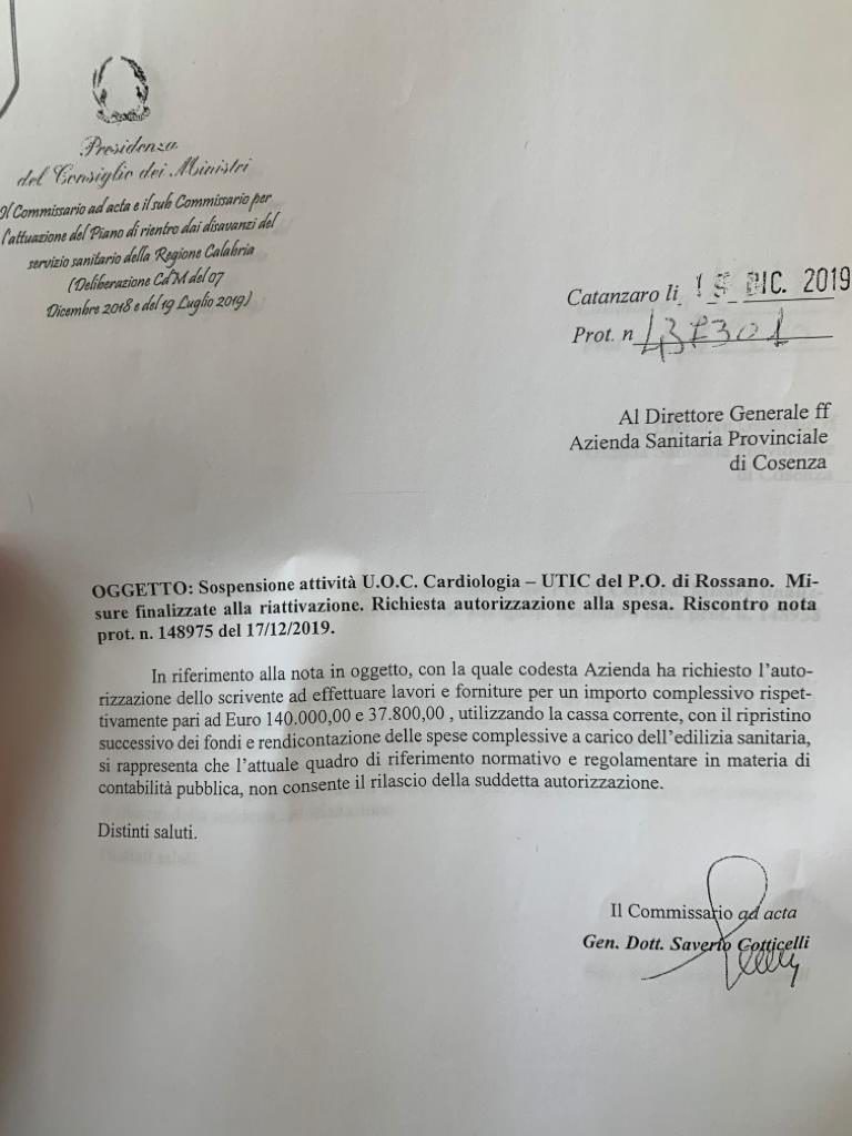 «Chi avrà interloquito – ha scritto Flavio Stasi – con questo convinto e coerente funzionario dello Stato? E soprattutto, a che cosa serve un Commissario se non riesce ad autorizzarti 40 mila euro per la messa in funzione di un reparto vitale come Cardiologia?»