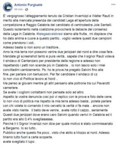 LA LEGA: «NON È NEL PARTITO» La polemica innescata da Furgiuele ha preso rapidamente piede e dalla segreteria regionale della Lega è arrivata una comunicazione: «La Lega Calabria comunica che Antonio Furgiuele non è parte della Lega Calabria né ha mai ricoperto alcun ruolo di nessun genere. Le sue dichiarazioni (totalmente deliranti e prive di alcun fondamento) sono personali e non rispecchiano assolutamente la posizione del fratello, Domenico Furgiuele, il quale si è dissociato pubblicamente tanto dalla persona che dalle parole scritte da Antonio Furgiuele. Riteniamo comunque quantomeno particolare la scelta di dare rilevanza a un post solo in virtù del cognome del soggetto, privo di contenuti politici o di interesse generale, titolando con un fuorviante: “acque agitate in Lega”». Rispetto al titolo non ci sentiamo di dover spiegare alcunché. Le acque nella Lega sono agitate da mesi, come conferma la raccolta firme in corso per sfiduciare il commissario Cristian Invernizzi.