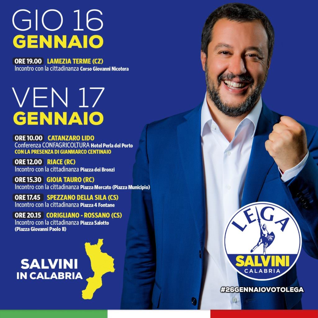 IL PROGRAMMA Quella di Matteo Salvini sarà una due giorni ricca di appuntamenti. Prima tappa a Lamezia Terme il prossimo 16 gennaio, dalle 19, su Corso Giovanni Nicotera; venerdì 17 gennaio farà tappa a Catanzaro Lido per un incontro con Confagricoltura Calabria alle 10; alle 12 Salvini raggiungerà Riace, borgo dell’ex sindaco Mimmo Lucano e attualmente governato dal primo cittadino filoleghista, Trifoli. Una visita, quella di Salvini nel “paese dell’accoglienza” non casuale: negli ultimi mesi, infatti, sono stati durissimi i confronti tra l’ex ministro dell’Interno e l’ex primo cittadino di Riace sul tema legato all’immigrazione. Ma il tour di Salvini non si fermerà a Riace: alle 15.30, infatti, il leader leghista sarà a Gioia Tauro, alle 17.45 a Spezzano della Sila e infine alle 20.15 a Corigliano Rossano.