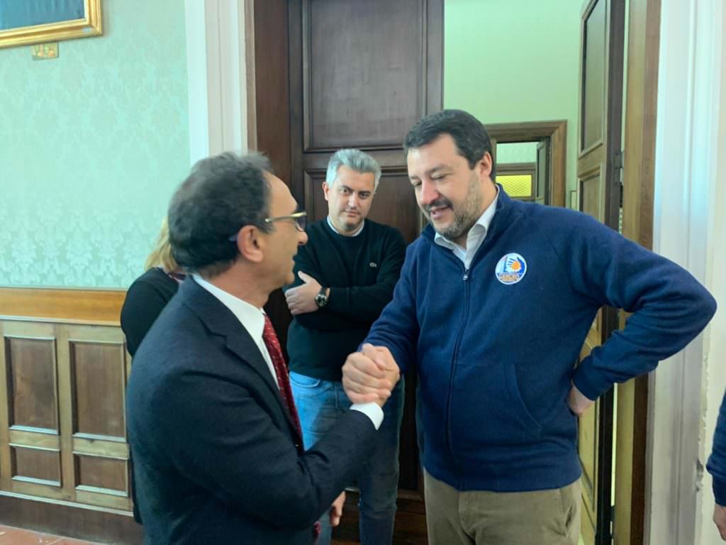 Visita del leader della Lega negli uffici giudiziari prima del tour elettorale programmato in giornata. Per Salvini un incontro «cordiale, costruttivo e positivo». L’endorsement per il sindaco Abramo…
