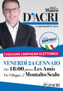 MONTALTO Venerdì 24 gennaio alle ore 18 nei locali del ristorante Les Amis di Montalto Scalo, via Villaggio 22 è in programma la chiusura della campagna elettorale di Mauro D’Acri, candidato nella lista “Jole Santelli Presidente”. Si tratta dell’ultimo incontro pubblico prima delle elezioni per il rinnovo del consiglio regionale della Calabria del 26 gennaio 2020.