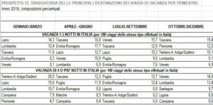 LE REGIONI REGINE DEL TURISMO Andando a scandagliare il report, emerge infatti che le località prese d’assalto dai turisti italiani si trovano in 5 regioni: Toscana, Emilia-Romagna, Lazio, Lombardia e Veneto. A cui si aggiunge da quest’anno anche il Trentino Alto Adige. Oltre la metà dei viaggi effettuati nel corso del 2019 (per l’esattezza il 52,7%) hanno riguardato queste sei regioni. Tra queste è la Toscana che si aggiudica ancora una volta la meta regina dei viaggi per turismo degli italiani: da sola assorbe infatti 11,2% del totale complessivo dei movimenti registrati nel corso del 2019 e sale al 14,9% se si considerano le permanenze più brevi.