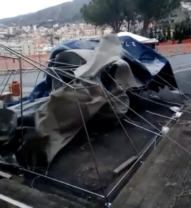 «Crolla "per neve" la tenda pre-triage a San Giovanni in Fiore». E a Paola la porta via il vento – VIDEO