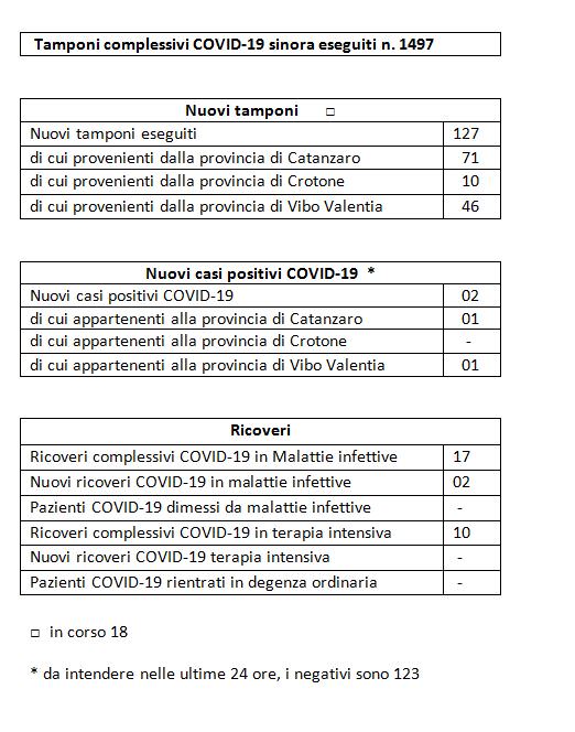 Ecco nello specifico la tabella riassuntiva della situazione del bollettino emesso dall’Azienda ospedaliera “Pugliese Ciaccio”.