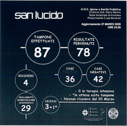 SAN LUCIDO Dal Centro operativo comunale di San Lucido arrivano notizie di un ulteriore aumento di contagi nel centro del Tirreno cosentino “chiuso” qualche giorno fa dalla presidente della Regione Jole Santelli. Secondo il documento pubblicato nella notte di venerdì sul sito del Comune (ore dopo la pubblicazione del bollettino della Regione), risulta che il totale dei casi positivi al Coronavirus è di 36.