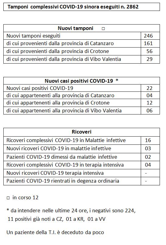 I DATI DEL BOLLETTINO Dal bollettino dell’ospedale emerge che il numero dei contagi da Coronavirus nell’area centrale della Calabria che comprende Catanzaro, Crotone e Vibo Valentia è salito. Il laboratorio di analisi dell’ospedale “Pugliese Ciaccio” di Catanzaro ha registrato 22 nuovi casi positivi: 4 del Catanzarese, 12 del Crotonese e6 del Vibonese. Secondo quanto riferito da fonti ospedaliere, il contagiato di Catanzaro sarebbe un infermiere del reparto di Malattie infettive dello stesso ospedale. I tamponi effettuati nelle ultime 24 ore sono stati 246. Ieri i nuovi casi positivi erano stati 2 su 160 tamponi.