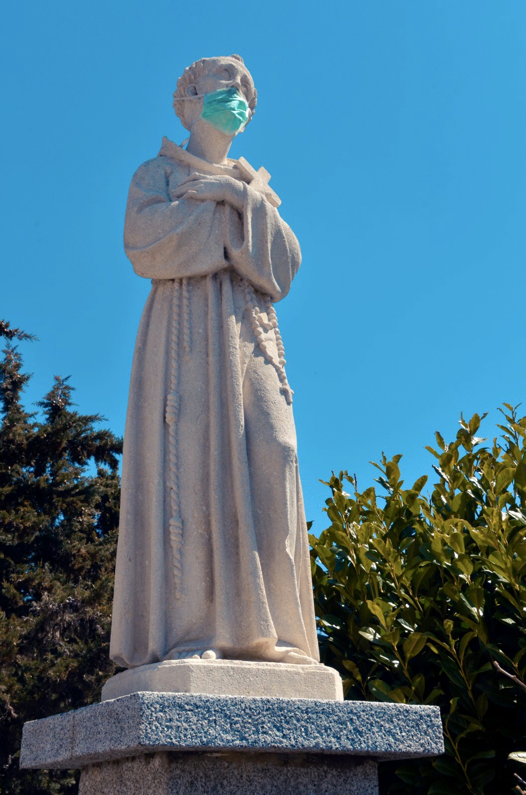 Francesco, immerso in un bellissimo cielo celeste, sembra invocare Dio con le parole del Papa: “Svegliati Signore”. In tempo di coranavirus qualcuno ha pensato di mettere una mascherina sul volto del Patrono d’Italia. Un gesto ‘leggero’ o forse una richiesta d’aiuto. Certamente non blasfemo!