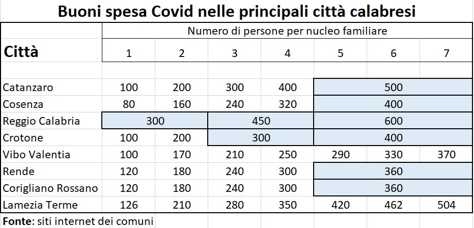 In Calabria, «tra le città analizzate, Vibo Valentia è quella che assegna l’aiuto più basso (210 euro). Nelle città di Corigliano Rossano, Cosenza e Rende l’importo previsto è 240 euro, a Lamezia Terme 280 euro (che possono diventare 336 se uno dei tre componenti è un bambino di 0-6 anni, oppure un portatore di handicap o di patologie croniche). Alla famiglia media con 3 persone, il comune capoluogo di regione, Catanzaro, eroga 300 euro, così com’è previsto a Crotone».