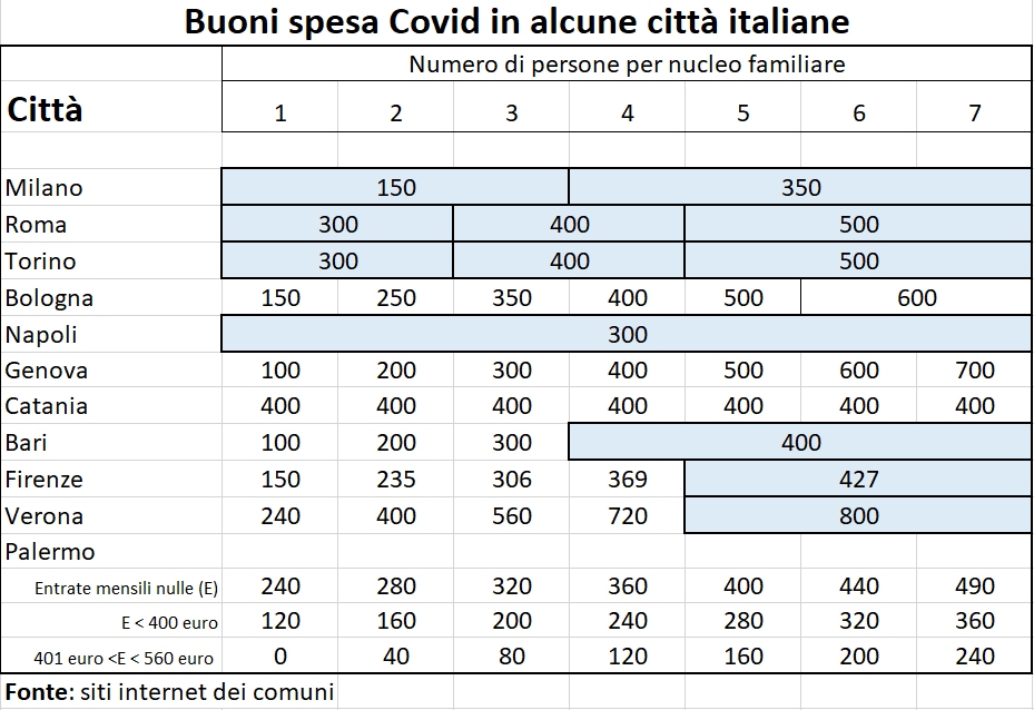 Le differenze si riscontrano anche all’interno della stessa regione. Un «risultato prevedibile – spiega il docente –, poiché, data l’emergenza e l’assenza di linee guida, i comuni hanno agito in autonomia. Tra quelli esaminati, l’unico comune che sembra aver utilizzato un riferimento di dati per fissare l’ammontare dei buoni spesa è Lamezia Terme, che, nell’apposito avviso pubblico, cita la spesa alimentare delle famiglie italiane del 2018 di fonte Istat».