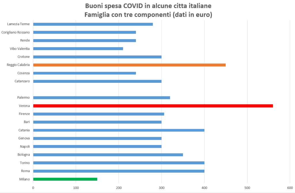 «A Milano – scrive Aiello – una famiglia che è in emergenza alimentare riceve 150 Euro se è composta da 1 fino a 3 membri e 350 euro se ha 4 o più componenti. A Bologna il buono per una famiglia con un solo componente è uguale a quello di una famiglia di Milano con tre familiari. Se vivi a Bologna in una famiglia di 5 persone ricevi un buono spesa di 500 euro che è uguale a quello previsto, per esempio, a Genova e a Torino, ma maggiore di ben 150 euro di quello che otterrà una famiglia milanese. A Firenze la stessa famiglia percepisce 427 euro, a Reggio Calabria 600 euro, a Catanzaro 500 euro, mentre a Bari, Cosenza, Crotone il contributo è pari a 400 euro».