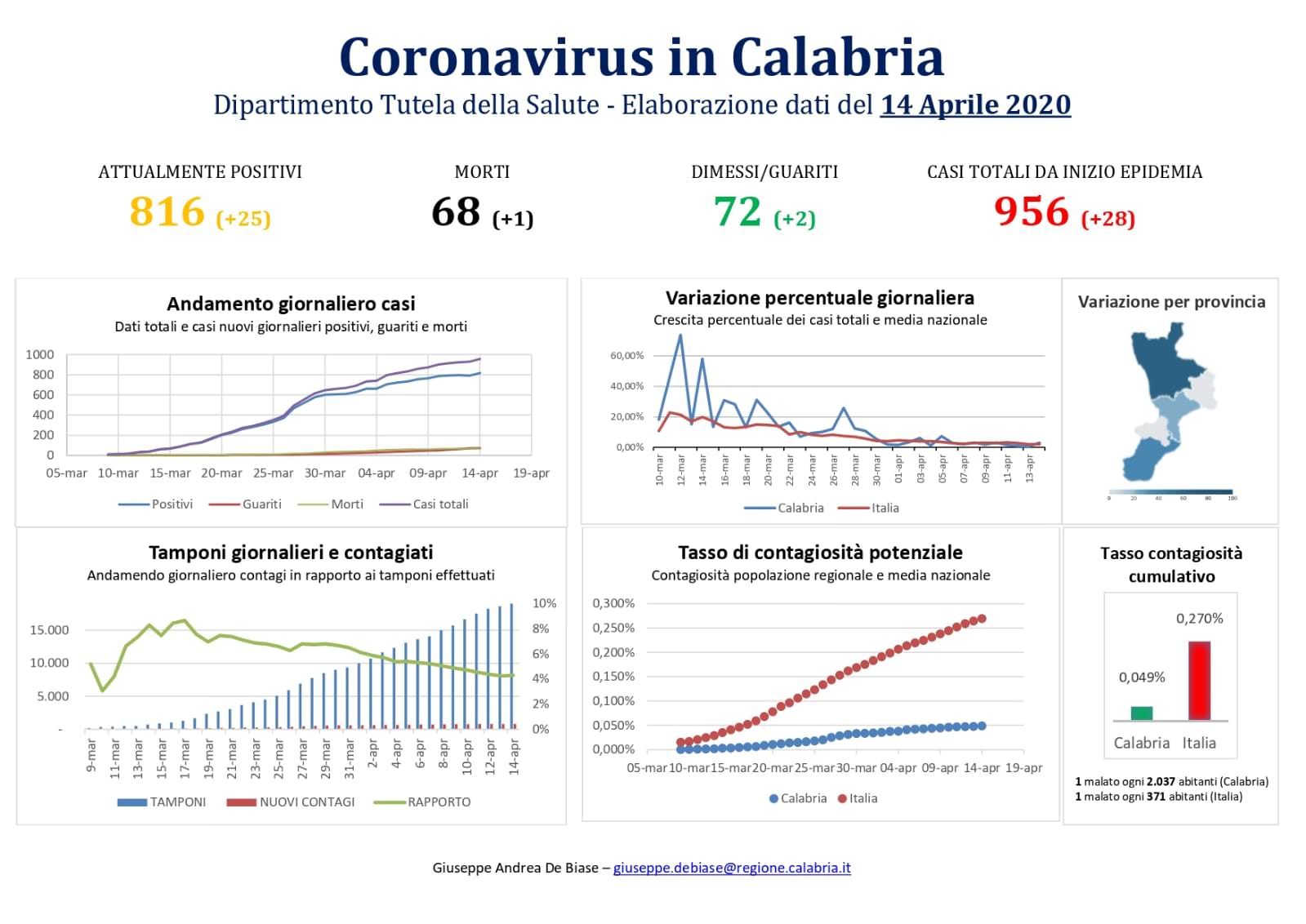 Nel conteggio sono compresi anche i due pazienti di Bergamo trasferiti a Catanzaro, mentre non sono compresi i numeri del contagio pervenuti dopo la comunicazione dei dati alla Protezione Civile Nazionale.
