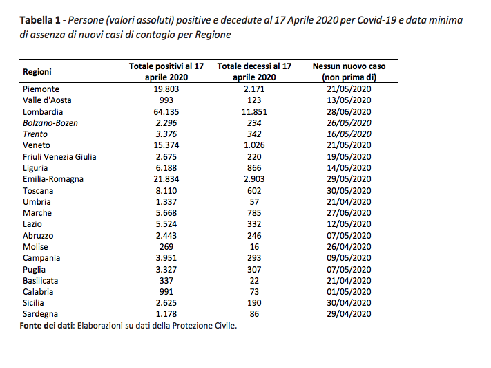 L’Osservatorio, spiega il direttore scientifico Alessandro Solipaca, «ha effettuato un’analisi, regione per regione, con l’obiettivo di individuare la data a partire dalla quale è verosimile attendersi l’azzeramento dei nuovi contagi e si basa sui dati messi a disposizione dalla Protezione Civile fino 17 aprile». Secondo le proiezioni, a uscire per prima dal contagio da Covid-19 sarebbero la Basilicata e l’Umbria, che il 17 aprile contavano rispettivamente solo 1 e 8 nuovi casi.