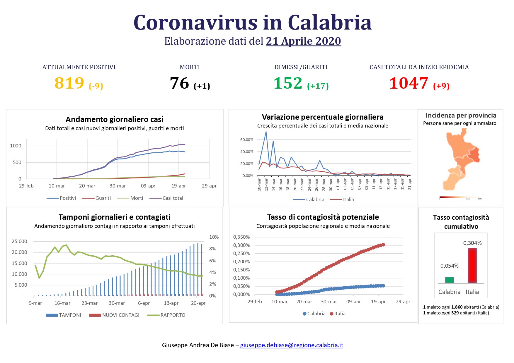 – Reggio Calabria: 31 in reparto; 2 in rianimazione; 150 in isolamento domiciliare; 45 guariti; 15 deceduti.