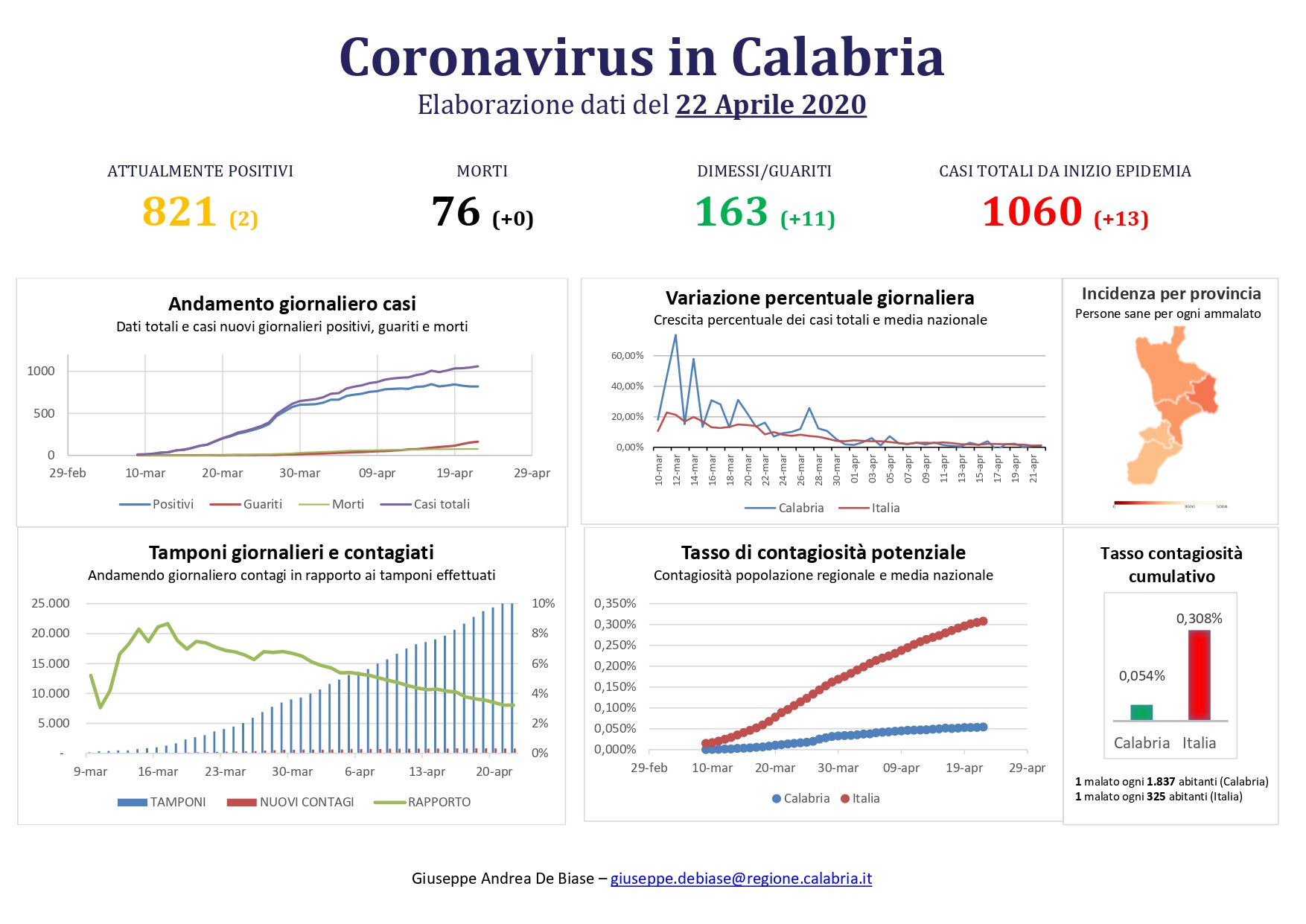 – Crotone: 13 in reparto; 72 in isolamento domiciliare; 21 guariti; 6 deceduti.