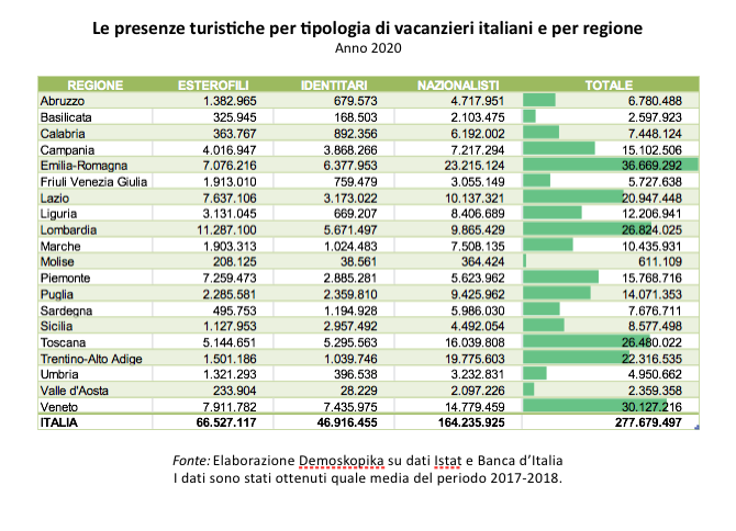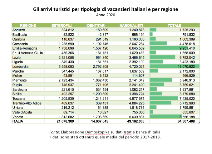 Vantaggi: dal “turismo di prossimità” quasi 21 miliardi di euro. Sarebbe pari a 20,6 miliardi il beneficio, misurato in termini di spesa turistica, generato dai cosiddetti “turisti autoctoni”: 5 miliardi in dote agli “esterofili”, 3,5 miliardi provenienti dal gruppo degli “identitari” e, la parte più consistente; pari a 12,1 miliardi in quota ai cosiddetti turisti “nazionalisti”. La metà, pari a 9,8 miliardi di euro, sarebbe a beneficio di quattro sistemi turistici regionali: Lombardia con 2,9 miliardi di euro, Veneto con 2,5 miliardi di euro, Emilia-Romagna con 2,3 miliardi di euro e Lazio con 2,1 miliardi di euro.