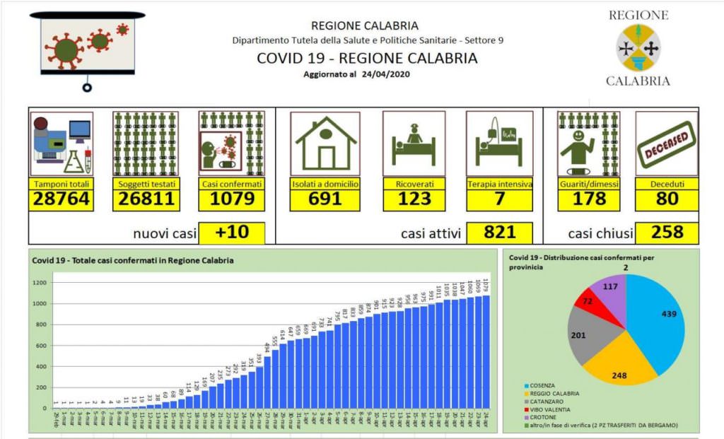 – Cosenza: 32 in reparto; 3 in rianimazione; 332 in isolamento domiciliare; 46 guariti; 25 deceduti.