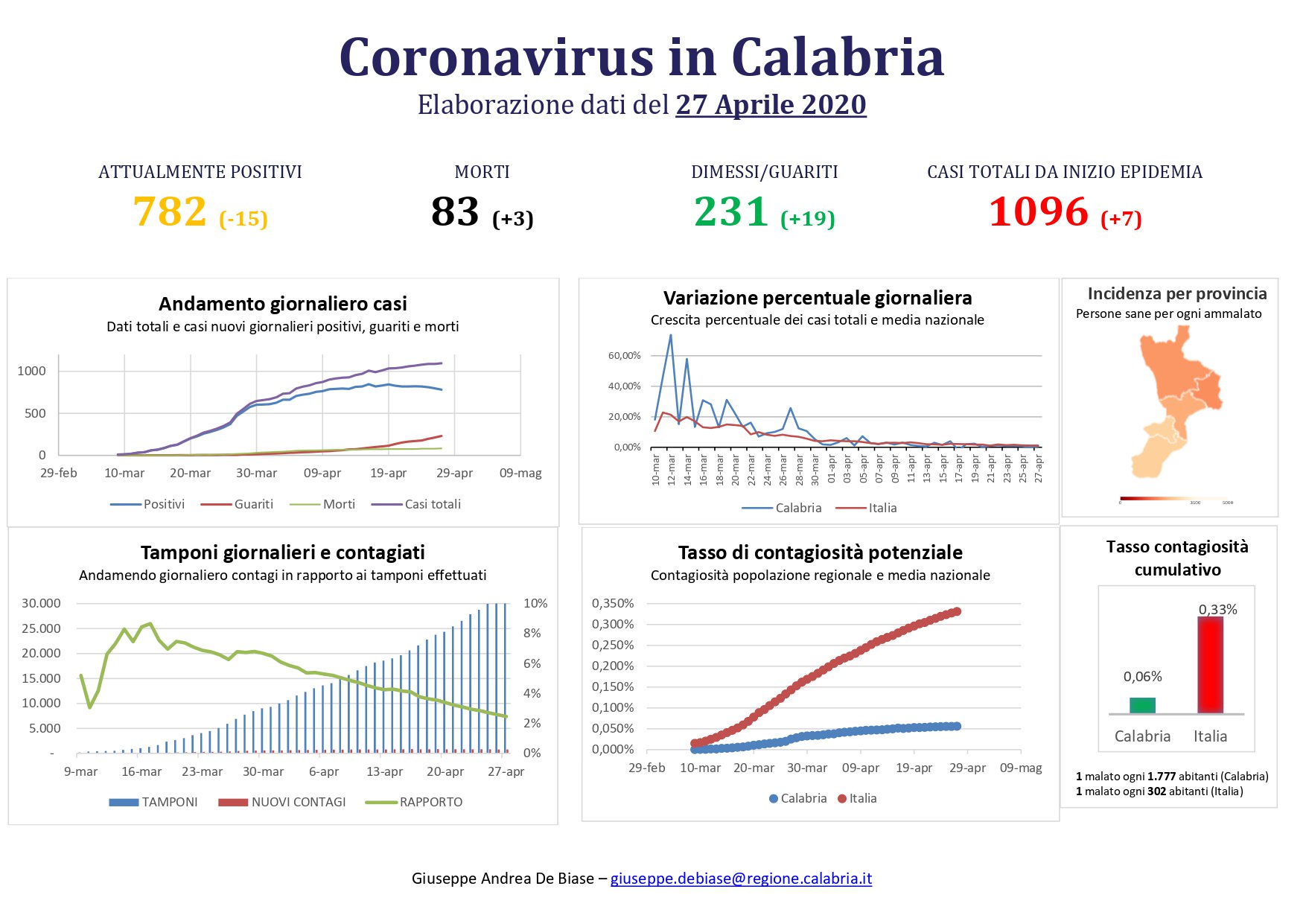 – Cosenza: 28 in reparto; 1 in rianimazione; 316 in isolamento domiciliare; 76 guariti; 27 deceduti.