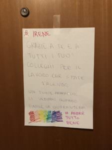 TREVIGLIO E’ una storia simile a molte altre e che stanno caratterizzando queste lunghissime settimane di sofferenza a causa del coronavirus. Ma i biglietti colorati e ricchi di speranza ritrovati sulla porta di casa di Irene Nasone sono anche l’espressione migliore della speranza rivolta ad un futuro che al momento appare lontano. Irene è una giovane dottoressa calabrese, impegnata nel pronto soccorso dell’ospedale Treviglio, in provincia di Bergamo, diventato a tutti gli effetti un ospedale Covid per fronteggiare la dura emergenza. E’ un medico in formazione specialistica in medicina d’emergenza, al primo anno e da circa sei mesi si trova nel piccolo centro della Bergamasca.