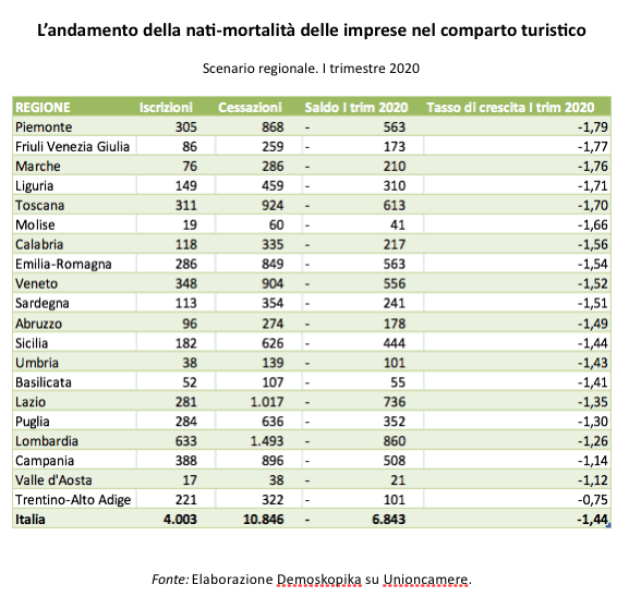 MENO 7MILA IMPRESE NEL PRIMO TRIMESTRE 2020 Il saldo tra iscrizioni e cessazioni delle imprese del settore turistico risente delle restrizioni necessarie per frenare l’avanzata della pandemia del Covid-19. Nel primo trimestre dell’anno in corso, infatti, elaborando i dati del sistema Unioncamere-Infocamere si conteggiano ben 6.843 imprese in meno contro un calo di 6.035 nel 2019 e di 5.560 nel 2018. Il peggiore bilancio della nati-mortalità del sistema turistico degli ultimi 25 anni. Un andamento negativo confermato anche dall’analisi della serie storica del tasso di crescita quale rapporto tra il saldo fra iscrizioni e cessazioni rilevato a fine trimestre e lo stock delle imprese registrate alla fine dell’anno precedente. In particolare, nei primi tre mesi del 2020, il tasso di crescita demografica delle imprese ha registrato il più alto valore negativo dal 1996 ad oggi: si parte da uno 0,22% del 1996 per arrivare al valore più elevato dell’1,44% nella prima parte dell’anno in corso. Si tratta di un andamento negativo che si riflette anche a livello territoriale. È il Piemonte, con l’1,79%, a registrare il più elevato tasso di decrescita immediatamente preceduto dal Friuli Venezia Giulia (-1,77%) e dalle Marche (-1,76%). Sul versante opposto, i sistemi turistici locali con una riduzione minore del rapporto tra il saldo fra iscrizioni e cessazioni, quindi “più performanti”, risultano il Trentino-Alto Adige (-0,75%) seguito dalla Valle d’Aosta (-1,12%) e, infine, dalla Campania (-1,14%). La Calabria, con un tasso di crescita dell’1,56%, si colloca al di sopra della media nazionale per valori negativi dell’indicatore.