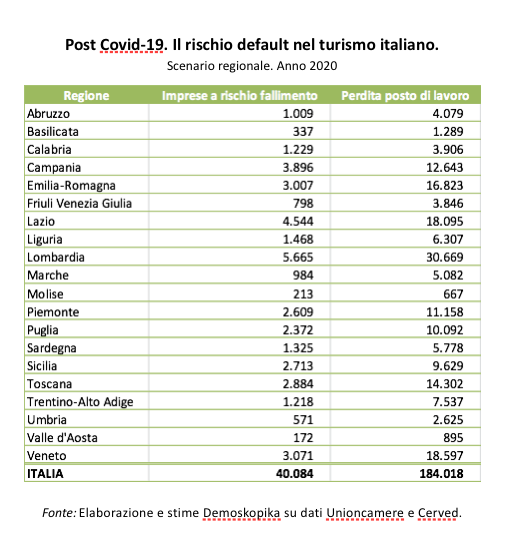 UN ADDETTO SU 10 POTREBBE RESTARE SENZA LAVORO La mortalità imprenditoriale si ripercuoterebbe immediatamente sul mercato del lavoro. Sarebbero poco più di 184 mila, infatti, i posti che andrebbero in fumo come diretta conseguenza dell’uscita definitiva dal mercato di migliaia di imprese nel settore turistico del Belpaese. Poco meno di 31 mila sarebbe la perdita quantificata nel solo sistema turistico della Lombardia a cui seguirebbero il Veneto (-18.597 addetti), il Lazio (-18.095 addetti), l’Emilia-Romagna (-16.823 addetti) e la Toscana (-14.302 addetti). A seguire, in una fascia di perdita tra i 7 mila e i 10 mila posti di lavoro, la Campania (-12.643), il Piemonte (-11.158 addetti), la Puglia (-10.092 addetti), la Sicilia (-9.629 addetti) e, infine, il Trentino-Alto Adige (-7.537 addetti). Al di sotto di questa soglia si collocano i rimanenti sistemi turistici locali: Liguria (-6.307 addetti), Sardegna (-5.778 addetti), Marche (-5.082 addetti), Abruzzo (-4.079 addetti), Calabria (-3.906 addetti), Friuli Venezia Giulia (-3.846 addetti). In coda, infine, per il rischio di perdita di posti di lavoro in valore assoluto, si collocano Umbria (-2.625 addetti), Basilicata (-1.289 addetti), Valle d’Aosta (895 addetti) e Molise (667 addetti).